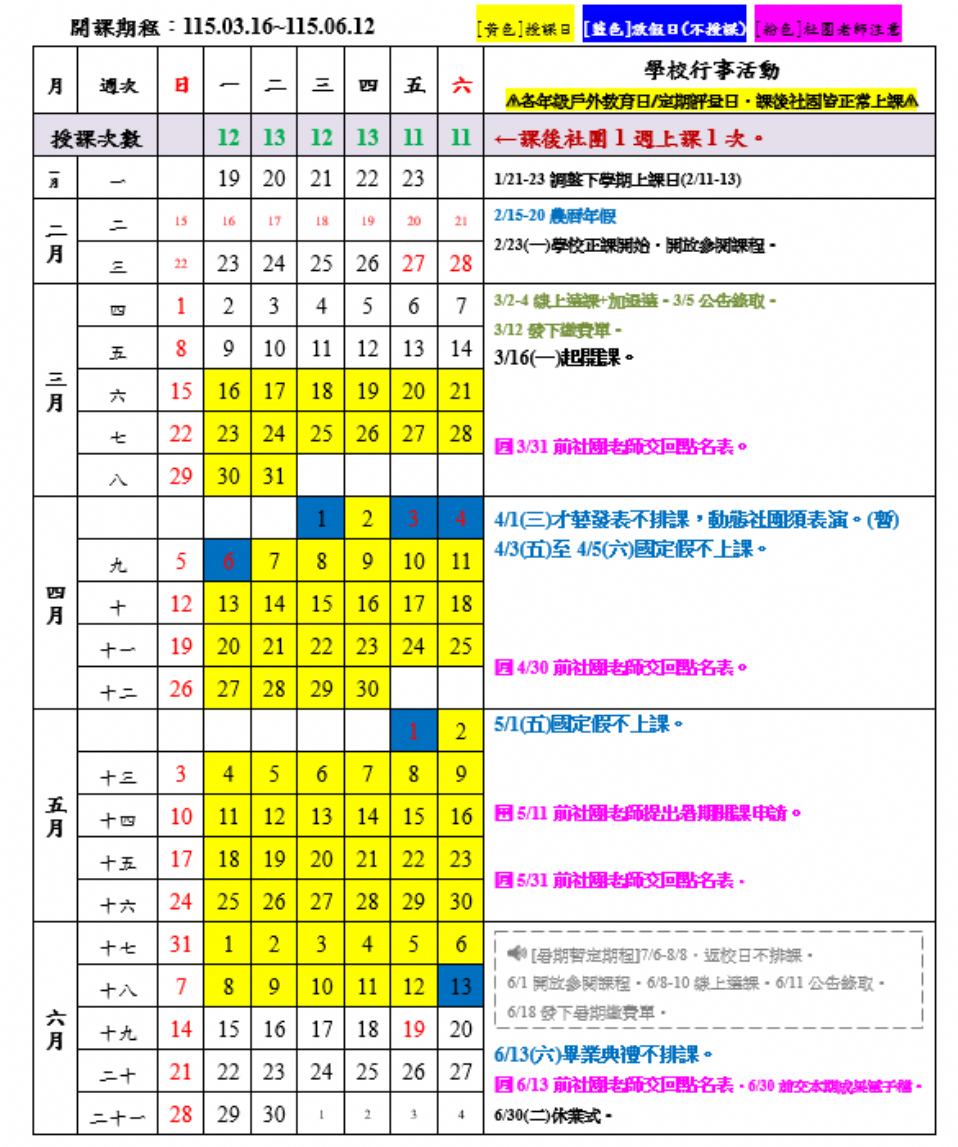 ☆114下學期開課期程:3/16(一)~6/12(五);學校活動&補假日、國定(連)假日皆不排課。(本期起,恢復每月1&5日排課。)